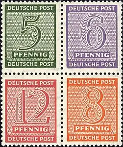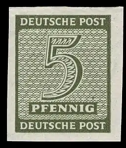 В пределах Советской оккупационной зоны Германии в 1945—1946 годах издавались марки для почтовых нужд, в том числе и на территории Саксонии[19]. Они имеют ряд характерных особенностей. Так, например, в условиях недостатка клея для гуммирования марок в этот период применялся так называемый экономный клей, когда клеевой слой наносился не по всей поверхности марочного листа, а с образованием пробелов на бумаге[20].