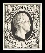 С 1851 по 1863 год выпускались марки с изображением герба и портретами королей — Фридриха Августа II и Иоганна. При этом при изготовлении почтовых марок Саксонии 1851 года применялась калькография — вид гравюры на меди, когда рисунок на пластине делался гравировкой в сочетании с протравливанием кислотой[14]. С 1859 года в качестве почтовых марок использовались также вырезки знаков почтовой оплаты из цельных вещей[3][8][12]. Для отделения марок от листа применялась просечка[15].