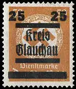 В июне 1945 года в Глаухау были выпущены провизорные марки — надпечатка чёрной краской «Kreis Glauchau» («Округ Глаухау») и частично нового номинала на почтовых и служебных марках Германии. Подготовленная в августе 1945 года серия с надпечаткой герба города в обращение не поступила. Известны также пробные экземпляры[3][39].