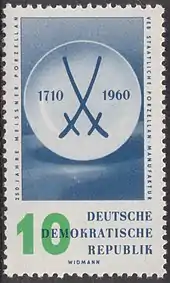 Сюжеты о самой Саксонии и связанные с ней много раз появлялись на почтовых марках немецких государств. Например, в 1960 году вышла серия из пяти марок ГДР в ознаменование 250-летия государственной фарфоровой мануфактуры в саксонском городе Мейсен. На одной из миниатюр была изображена тарелка со знаком в виде двух скрещённых мечей. Эти мечи являются одним из элементов герба Курфюршества Саксония, а также эмблемой самого предприятия, которой традиционно маркируются изделия из мейсенского фарфора. Мейсен обязан основанием фарфорового производства Августу II Сильному, тогдашнему саксонскому курфюрсту[44].