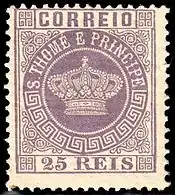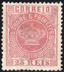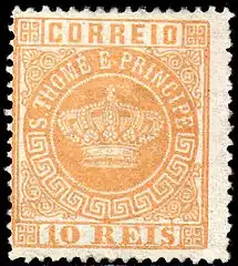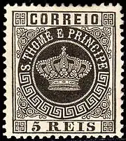 ![]() Первая марка колониального типа для Сан-Томе и Принсипи из серии «Корона», номиналом в 5 рейсов(1869) | |