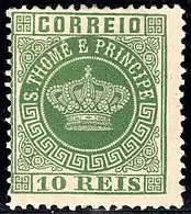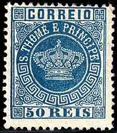 Первые почтовые марки Сан-Томе и Принсипи появились в 1869 году[1][2]. Это были марки колониального типа, выпускавшиеся в то время Португалией для своих колоний[2] в рамках серии «Корона» (или «Португальская корона»). Согласно каталогу «Скотт», серия имела девять номиналов и марки выходили в разновидностях в течение 1869—1875 годов[5].