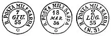 Во время Крымской войны (1853—1855) для нужд Сардинских экспедиционных сил работала полевая почта. Были открыты два её отделения: 24 мая 1855 года — в Балаклаве, а позднее — в Константинополе. До мая 1856 года в Балаклаве использовался штемпель с надписью «R. Posta Mile Sarda» («Королевская сардинская военная почта») и «розеткой» в нижней части, состоящей из шести или восьми «лепестков». Самая ранняя дата гашения, известная на сегодняшний день, — 28 мая 1855 на марке Сардинии из третьего выпуска номиналом в 20 чентезимо[3][11].