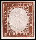 ![]() Первая почтовая марка Сардинского королевства, 1851 (Mi #1) | |