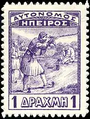 ![]() Почтовая марка Эпира номиналом в 1 драхму с изображением пехотинца, 1914 (Sc #?) | |