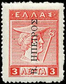 Греция возобновила контроль над Эпиром в ноябре 1914 года; 30 числа того же месяца для удовлетворения почтовых нужд региона были выпущены марки «военного выпуска» с надпечаткой греч. «B. ΗΠΕΙΡΟΣ», выполненной горизонтально в чёрном цвете; также были сделаны надпечатки красного цвета, но так и не были выпущены в обращение. (Известны несколько гашеных экземпляров.)[5] Они заменили стандартные выпуски Эпира. В декабре 1915 года такая же надпечатка была нанесена вертикально, в направлении либо снизу вверх, либо сверху вниз, на греческие стандартные почтовые марки 1911 и 1913 годов выпуска[6]. Все они подделывались.