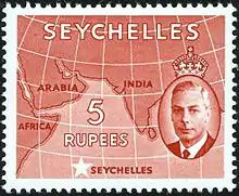 Почтовая марка Сейшельских Островов с одним и тем же сюжетом, которая была первоначально выпущена в 1938 году для короля Георга VI, затем с изменённым портретом его же в 1952 году и наконец для королевы Елизаветы II в 1954 году. Все они выполнены способом фотогравюры в типографии Harrison & Sons.