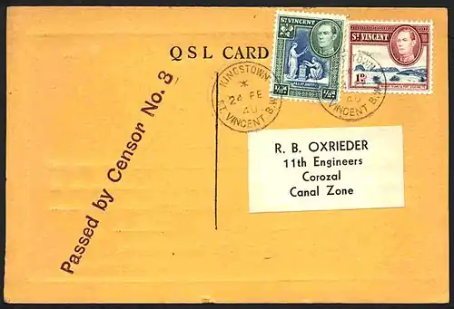 ![]() Стандартные марки Сент-Винсента с портретом короля Георга VI и местными видами, 1938 (Mi #119—121, 123, 125, 126) ![]() Две марки (Mi #119, 120) из стандартного выпуска Сент-Винсента 1938 года на QSL-карточке, отправленной в 1940 году в Зону Панамского канала и прошедшей перлюстрацию с соответствующей пометкой цензора |