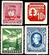 21 марта 1939 года в обращение поступили первые марки Словацкой республики — чехословацкие марки 1929—1938 годов с красной или синей надпечаткой словацк. «Slovenský stát / 1939» («Словацкое государство 1939»). Серия состояла из марок 21 номинала.[2] В сентябре того же года была выпущена серия «Национальные костюмы», состоящая из трёх марок оригинальных рисунков с надписью «Slovensko»[1][3].