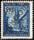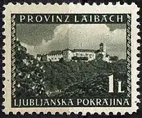 После освобождения страны марки видовой серии Люблянской провинции надпечатали — изображение звезды, контура горы Триглав и надпись словен. «Jugoslavija / * / Slovenija (по диагонали) / 9 * 5 / 1945 / Jugoslavija». Они использовались до 30 июня 1945 года, а затем их заменили выпусками Югославии[1][4][8].