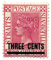Когда Стрейтс-Сетлментс стала королевской колонией в 1867 году, там начался выпуск собственных почтовых марок[1], даже уже по той причине, что в этой колонии была принята денежная единица на основе 96 центов к серебряному доллару. Начиная с 1 сентября 1867 года, на имевшихся запасах девяти типов индийских марок были сделаны надпечатки короны и нового номинала в центах. Напечатанные фирмой De La Rue для Стрейтс-Сетлментс почтовые марки начали поступать в декабре. Для них характерна заметная белая рамка вокруг профиля Виктории с надписью «STRAITS SETTLEMENTS POSTAGE» («Почтовый сбор Стрейтс-Сетлментс»). Серия марок девяти номиналов, от 2 до 96 центов, выходила постепенно, при этом марка номиналом в 30 центов вышла лишь в 1872 году.