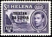 ![]() Почтовая марка Святой Елены 1952 г. с надпечаткой для использования на Тристан-да-Кунья с 1952 г. (Sc #?) | |