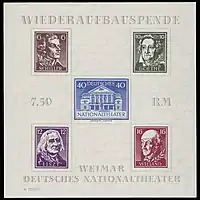 В декабре 1945 года были выпущены два почтовых блока с доплатой на благотворительные цели — в фонд помощи жертвам фашизма и на социальные нужды. В марте 1946 года выпустили ещё один блок с наценкой в фонд восстановления Национального театра в Веймаре. Он известен в двух вариантах. Первый печатался в типографии Гизике и Девриент в Лейпциге на тонкой белой бумаге с водяным знаком, без клея и без зубцов. Второй — в типографии Оленрота в Эрфурте на серо-коричневой бумаге с клеем и без водяного знака, с зигзагообразной просечкой. На марках блока художник Э. Шонер изобразил портреты Ф. Шиллера, В. Гёте, Ф. Листа, К. Виланда и здание театра[2][3].