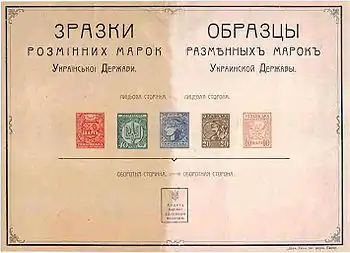 4 января 1919 года[6], уже после падения Украинской державы, была выпущена почтовая марка с названием государства «Українська Держава» («Украинская держава») номиналом 20 гривен (Sc #48). Рисунок марки представлял собой орнамент в виде рамки в стиле барокко с изображением тризубца в верхний её части[1]. Автором этой марки был художник Л. А. Обозненко. Ввиду высокого номинала она использовалась преимущественно на формах для денежных переводов и на посылочных квитанциях[7].