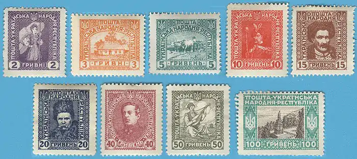 ![]() 2 гривны — аллегория «Молодая Украина», 3 гривны — ферма, 5 гривен — воловья упряжка, 10 гривен — Богдан Хмельницкий, 15 гривен — Иван Мазепа, 20 гривен — Тарас Шевченко, 40 гривен — Симон Петлюра, 50 гривен — казак-музыкант, 100 гривен — памятник Святому Владимиру (Mi #II—VII, IX, XI, XIII; Yt #135—140, 142, 144, 146) |