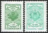 «Государственный герб». В 1994 году были выпущены марки номиналом 75 сум-купонов, в 1995 — 1, 2, 3, 6 и 15 сумов. В 1997 — 6 сумов, в 1998 — 2, 3, 6, 12, 15 и 45 сумов, в 1999 — 3 и 6 сумов, в 2000 — 5, 10, 15, 17, 30, 40, 45 и 60 сумов, в 2001 — 15, 17, 20, 25, 30, 33, 40, 45, 50, 60 и 100 сумов, в 2003 — 30 и 100 сумов, в 2004 — 5, 10, 30 и 60 сумов, в 2005 — 5, 30, 60 и 125 сумов, в 2006 — 35, 65, 200, 250, 290, 350, 430, 2500 и 3700 сумов.