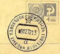 Почтовые отправления на территории УССР гасились почтовыми штемпелями на украинском и русском языках.
