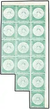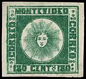 Первая обычная серия марок, эмитированная с одобрения государства, увидела свет 1 июля 1859 года и напоминала второй частный выпуск «Солнце Монтевидео»[12].