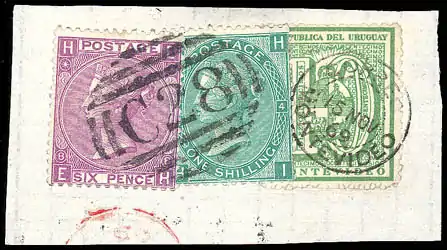 Известно очень мало конвертов до 1872 года, адресованных на другой берег Атлантики, с наклееными на них уругвайскими почтовыми марками. Таково следствие незаконных действий консульств иностранных государств в Монтевидео, которые получали и отправляли почтовые отправления с помощью судов, плавающих под флагами их собственных государств, без какого-либо участия уругвайской почтовой службы. В Британском консульстве в Монтевидео в 1862—1872 годах использовались почтовые марки Великобритании, которые могут быть определены по наличию оттиска номерного (буквенно-цифрового) почтового штемпеля «C28»[12].