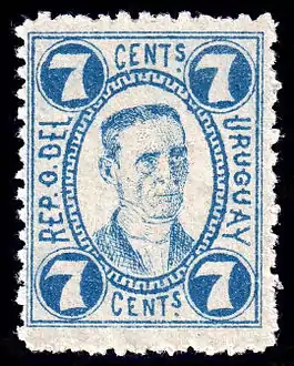 «Rep. O. del Uruguay» («Восточная Республика Уругвай»): 7 сентесимо, с изображением Хоакина Суареса, 1881 (Sc #45)