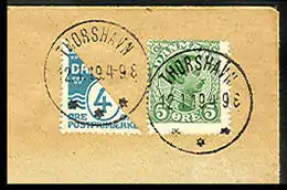 Вырезка из почтового конверта, отправленного из Торсхавна в 1919 году, франкированного маркой в 5 эре и разрезанной маркой в 4 эре |