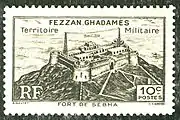 ![]() Марка военной территории Феццана—Гадамеса номиналом в 10 сантимов с изображением крепости в Сабхе (1946)[^] | |