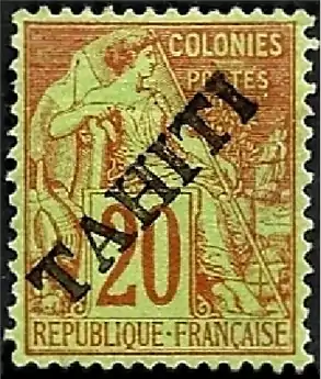 В 1893 году на оставшихся запасах обыкновенных и доплатных марок французских колоний были сделаны два типа надпечаток: один тип представлял собой диагональную надпечатку слова «TAHITI» («Таити»), а другой — горизонтальную надпечатку текста «1893 / TAHITI» («1893 / Таити»). Некоторых номиналов почтовых марок оставалось очень мало для производства надпечаток, и подлинные надпечатки довольно редки, редчайшая из них — горизонтальная надпечатка на желтой марке номиналом в 25 сантимов, оцениваемая сейчас примерно в 20 тысяч долларов США.