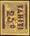 Так, в 1882 году нехватка почтовых марок номиналом в 25 сантимов привела к появлению надпечатки нового номинала на почтовых марках менее популярных номиналов. Некоторые надпечатки также включали название «TAHITI» («Таити»)[3][6]. Эта же история повторилась в 1884 году с марками номиналом в 5 и 10 сантимов.