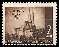 Первые марки Независимого государства Хорватия (НГХ) появились 12 апреля 1941 года. Это была надпечатка чёрной краской названия государства Nezavisna Država Hrvatska на марках Югославии 1939 года с портретом короля Петра II Карагеоргиевича. С июня того же года начала издаваться первая стандартная серия с видами страны и номиналами в кунах[1][4].