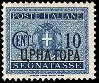 В июне 1941 года были также выпущены первые доплатные марки оккупированной Черногории. На доплатных марках Югославии 1931 года была сделана надпечатка теста в три строки: «Montenegro / Црна Гора / 17-IV-41-XIX». Так же в июне 1941 года на территории Черногории в обращение поступили доплатные марки Италии 1934 года с надпечаткой чёрной краской «Црна Гора»[5].