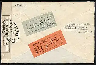 После оккупации Черногории в 1916 году австро-венгерскими войсками черногорское правительство переехало во французский город Бордо. При этом вся адресованная в Черногорию международная корреспонденция перенаправлялась в Бордо. На письма наклеивались специальные ярлыки для возврата отправителю. Всего известно три типа таких ярлыков: чёрный на синей бумаге с надписью фр. «RETOUR / A L’ENVOYEUR / S. P. / du M. / Bordeaux» («Возврат отправителю / Почтовая служба Черногории / Бордо»); чёрный на оранжевой бумаге с надписью «LE / DESTINATAIRE / N’A PU ÊTRE / ATTEINT / S. P. / du M. / Bordeaux» («Получатель не найден / Почтовая служба Черногории / Бордо»); синий на белой бумаге с черногорским гербом и надписью «MONTÉNÉGRO / (SERVICE DES POSTES EN FRANCE) / RETOUR A L’ENVOYEUR / LE DESTINATAIRE N’AYANT PU ÊTRE TOUCHÉ» («Черногория / (Почтовая служба во Франции) / Вернуть отправителю / Адресат отказался от получения»).