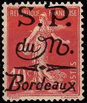 В качестве служебных почтовых марок для правительственной корреспонденции черногорское правительство в эмиграции с 6 по 27 июня 1916 года использовало французские почтовые марки 1900—1906 годов с контрольной надпечаткой «S. P. / du M. / Bordeaux». 28 июня французское почтовое управление запретило их применение[5][6][7].