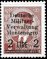 22 ноября 1943 года для Черногории была выпущена серия из девяти марок. На марках Югославии 1939 года с портретом короля Петра II Карагеоргиевича была сделана надпечатка текста в четыре строки нем. «Deutsche / Militär- / Verwaltung / Montenegro» («Немецкое военное управление Черногорией») и нового номинала в итальянских лирах[5].