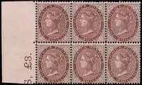 ![]() Блок из шести почтовых марок 1870 года номиналом в 1 шиллинг с ошибкой печати («$ вместо S») | |