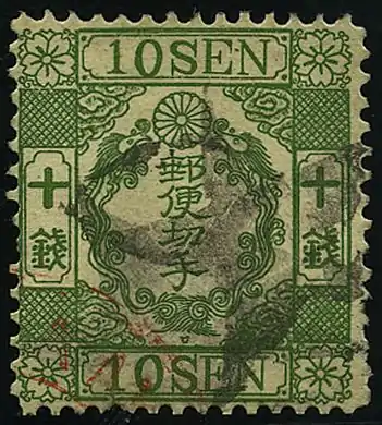 Марка в 10 сенов (1872). Элементы рисунка: хризантема, а также цветок вишни (по углам)