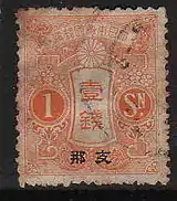 В 1900 году в ряде городов Китая начала работать японская консульская почта. Использовались почтовые марки Японии, на которых была сделана надпечатка слова «Китай» двумя иероглифами: яп. 那支[прим. 2][прим. 3]. 31 декабря 1922 года все японские почтовые отделения на территории Китая были закрыты, а почтовые марки вышли из обращения[4].