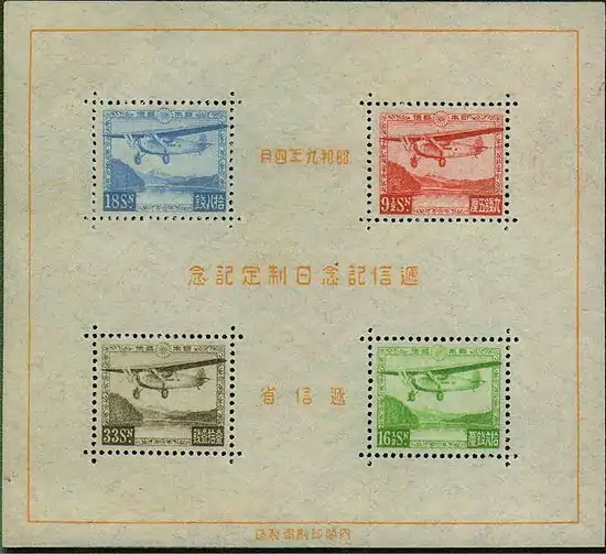 Авиапочтовые марки впервые появились в Японии в 1919 году[4]. На первом почтовом блоке страны 1934 года[4] были помещены четыре авиапочтовых марки.