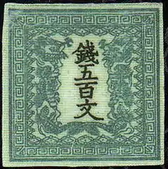 Первые японские почтовые марки появились в апреле 1871 года[4]. Это была серия из четырёх марок, номиналы которых соответствовали различным почтовых тарифам. Замысловатый рисунок в двух цветах состоял из пары драконов, обращённых мордами к центру, где чёрным цветом были напечатаны иероглифы, обозначающие номинал. Название государства на марках указано не было. Все надписи на марках были даны на японском языке[1][4]. Номиналы были указаны в монах: 48, 100, 200 и 500 монов. Печать почтовых марок каждого номинала производилась с помощью двух печатных плат на бумаге двух сортов, благодаря чему известны много их разновидностей[1]. В Японии первую серию марок принято называть «марками с драконами» (яп. 竜切手 рю:киттэ).