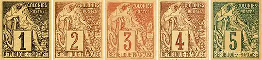 В 1892 году Франция начала эмиссию марок колониального типа — с названием владений в рамках общего выпуска типа Мореплавание и торговля.