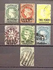 С 1863 по 1880 год первая марка была выпущена в различных цветах, с зубцовкой и с надпечаткой для каждого номинала от 1 пенни до 5 шиллингов. Марки этого дизайна оставались в обращении до 1884 года, когда для колонии была выпущена новая серия викторианских марок колониального типа.