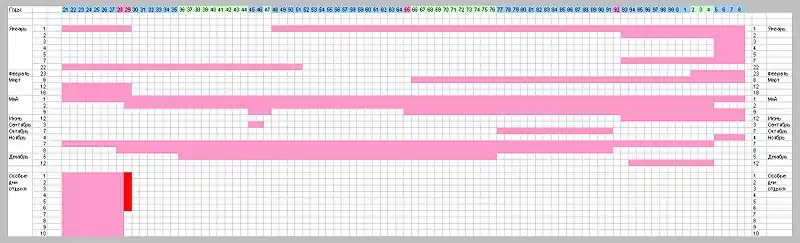 - Переходящие праздники отмечены розовым цветом. Они постоянно приходились на одни и те же дни недели, но дата их празднования переходила на разные числа в разные годы. Это четыре группы выходных дней: