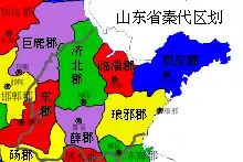 После того, как царство Цинь завоевало все прочие царства и создало первое в китайской истории единое централизованное государство, страна была разделена на 36 округов-цзюнь, из которых на территории современной провинции Шаньдун оказалось 11. Для усиления контроля над завоёванными территориями Цинь Шихуанди переселил прежнюю аристократию царства Ци в столицу и на западные земли империи, и снёс Цискую Великую стену, а также построил крупную дорогу государственного значения, связавшую Шаньдунский полуостров с центральными областями империи, что дало мощный толчок экономическому развитию региона. За время своего царствования Цинь Шихуанди совершил пять поездок на Шаньдунский полуостров.