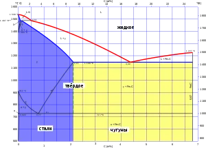 При концентрации углерода в сплаве свыше 2,14 % сплав называется «чугуном». Чугун — хрупкий легкоплавкий сплав, хорошо подходящий для литья, но, как правило, не поддающийся обработке ковкой. Чугун насыщен графитовыми включениями, делающими его неоднородным и механически непрочным. Температура начала плавления (солидус) чугуна составляет 1150 °C, полностью завершается плавление при 1200-1400 °C (ликвидус), в зависимости от состава.