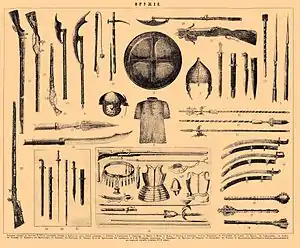 Вооружение различалось, в зависимости от стратификации. Мечи в основном применяли старшие дружинники и гриди. Первоначально это были мечи каролингского типа, длины около 90 см. Археологические данные показывают, что многие мечи были французскими, какие применялись во всей Европе. Происхождение многих мечей не удаётся установить. Старейший найденный меч русского производства датируется X веком. В то же время арабские источники сообщают, что на Руси было очень хорошо развито производство мечей.[11] Очень активно применяли боевые топоры двух типов — варяжские секиры на длинных рукоятях и славянские пехотные топорики. Широко было распространено ударное оружие — булавы с бронзовыми или железными навершиями. Кистени так же очень использовали, но как дополнительное оружие, а не основное. В X веке в Южной Руси приживаются сабли, более эффективные для борьбы с конными кочевниками. Поначалу они были массивными и слабо изогнутыми. В XIII веке начинается применение самого лучшего образца ударного оружия — шестопёра. Ещё одним типом оружия были чеканы и клевцы. Конечно же, применялись различные ножи, преимущественно скрамасакс и засапожник. Более простонародным оружием были ослопы. В народное ополчении, в случае бедности, применялось и дешёвое самодельное оружие — в частности вилы, цеп и деревянный ухват, который иногда неправильно называют рогатиной. Копья были нескольких типов. «Бронебойные» пехотные; кавалерийские; сулицы; противоконные рогатины. Ещё одним типом оружия была совня. Все умели пользоваться луками, поскольку они необходимы для охоты. Самострелы тоже использовались, но значительно реже. Метательные орудия известны на Руси не позднее X века.[12]