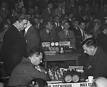В годы войны умерли экс-чемпионы мира Ласкер (1941) и Капабланка (1942). В 1944 году Вера Менчик погибла в Лондоне во время немецкой бомбардировки. В марте 1946 года умер Алехин, который незадолго до смерти вёл переговоры о матче с Ботвинником[198]. Организацию чемпионата мира взяла в свои руки ФИДЕ: по решению федерации новый чемпион должен был определиться в матч-турнире, в который были персонально приглашены Керес (после утраты независимости Эстонии он выступал за СССР), Файн и Решевский, а ещё три участника отбирались по результатам турнира в Гронингене, который состоялся в августе — сентябре того же года. Единоличную победу в нём одержал Ботвинник, вторым стал Эйве, третьим — двадцатипятилетний Василий Смыслов[198], годом ранее в радиоматче против США на второй доске выигравший обе партии у Решевского и моментально ворвавшийся в элиту[199]. Файн отказался от участия в турнире, так как это спутало бы его планы по защите диссертации по психологии (в следующие годы Файн полностью прекратил участие в соревнованиях и посвятил себя карьере психоаналитика)[200], и титул в итоге разыгрывали пять претендентов, проведшие друг с другом по 5 партий. Ботвинник победил с 14 очками из 20, вторым был Смыслов (11½), Керес и Решевский набрали по 10½, Эйве не смог составить им конкуренции (4)[201].