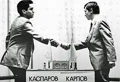 В 1984 году следующим соперником Карпова стал 21-летний советский гроссмейстер Гарри Каспаров. В финале отборочного цикла он победил неожиданно добравшегося до этой стадии 63-летнего Василия Смыслова, а в полуфинале — Виктора Корчного. Каспаров стал известен всему шахматному миру в 1979 году, когда в шестнадцать лет мастером был допущен в гроссмейстерский турнир в Баня-Луке (Югославия), в котором победил c отрывом в два очка. В следующие годы он победил в чемпионате мира среди юниоров (1980), разделил первое место в 49-м чемпионате СССР (самый молодой его победитель) и входил в состав сборной СССР, выигравшей олимпиады 1980 и 1982 годов[229][230]. Летом 1984 года в матче «Сборная СССР против сборной мира» (ремейке матча 1970 года) советская команда, возглавляемая Карповым и Каспаровым, победила со счётом 21:19, а чемпион и претендент выиграли микроматчи у соответственно Ульфа Андерссона (Швеция) и Яна Тиммана (Нидерланды) со счётом 2½:1½. В матче до шести побед Карпов одержал четвёртую уже в девятой партии[231]. Дальше последовала длительная серия ничьих, а 27-ю партию снова выиграл действующий чемпион. Но затем Каспаров перехватил инициативу, а после побед Каспарова подряд в 47-й и 48-й партий впервые в истории президент ФИДЕ Флоренсио Кампоманес прервал матч, мотивировав это тем, что его продолжение может нанести вред здоровью игроков[232]. Оба участника протестовали, заверяя, что готовы продолжать борьбу, но это не повлияло на решение. Состоявшийся вскоре конгресс ФИДЕ вернул формулу матча «на большинство из 24 партий». Новый матч между теми же соперниками состоялся осенью 1985 года, победив со счётом 13:11, Каспаров стал тринадцатым чемпионом мира. В 1986 году Каспаров выиграл и матч-реванш. Каспаров и Карпов провели между собой ещё два матча: в 1987 году (12:12, Каспаров сохранил титул, выиграв последнюю партию) после того, как Карпов на правах предыдущего чемпиона мира выиграл у победителя претендентского цикла Андрея Соколова (СССР), и в 1990 году (Карпов в финале очередного цикла Яна Тиммана, в титульном мачте Каспаров победил 12½:11½). Личное противостояние Карпова и Каспарова, которые провели пять матчей за звание чемпиона мира, в которых сыграли между собой 144 партии, не имеет аналогов в истории шахмат[233].