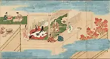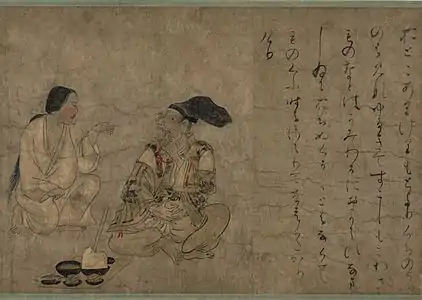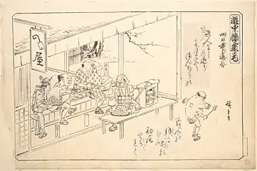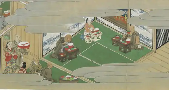 После приёма пищи следовал банкет с саке, на котором подавали горячие супы, суп с лапшой «контон», фаршированную орехами, а затем жареную на гриле рыбу и другие блюда[75]. Формальная обстановка первой части банкета контрастировала со свободной атмосферой второй[75].