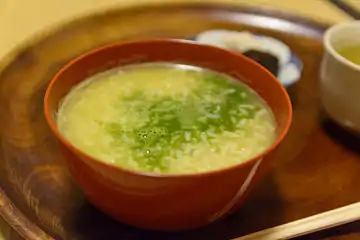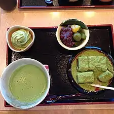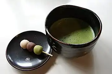 Традиция употребления чая со сладостями пришла в Японию из Китая через дзэн-буддизм[43]. Вместе с традицией третьего приёма пищи в обед она заложила фундамент японской чайной церемонии и кухни кайсэки[43]. При этом следует учитывать, что расцвет чаепития в Японии произошёл позже; первые два века чай пили как лекарство и для медитации[44].