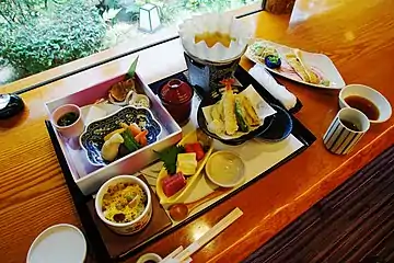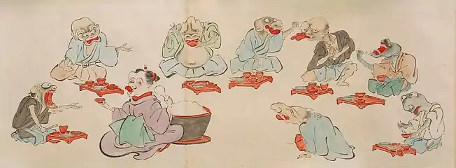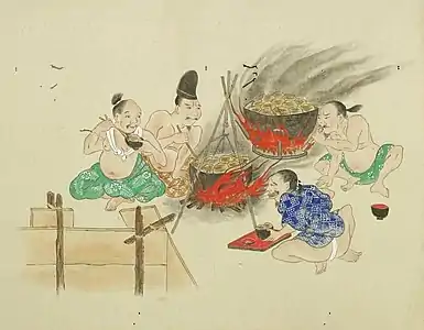 В Записках у изголовья Сэй-Сёнагон подмечает, что прибывшие для ремонта дворца рабочие едят необычно: сперва они полностью выпили суп, затем съели все овощи, а после этого взялись за рис; очевидно, что придворные манеры предполагали чередование блюд[79]. До XIII века знать принимала пищу два раза в день, в 1221 году император уже ел трижды в день[80].