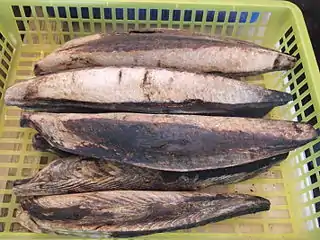 - «Сухие» продукты включали нарезанные тонкими ломтиками сушёную рыбу и мясо (лосося, фазана), варёное на пару и затем сушёное морское ушко или осьминога.